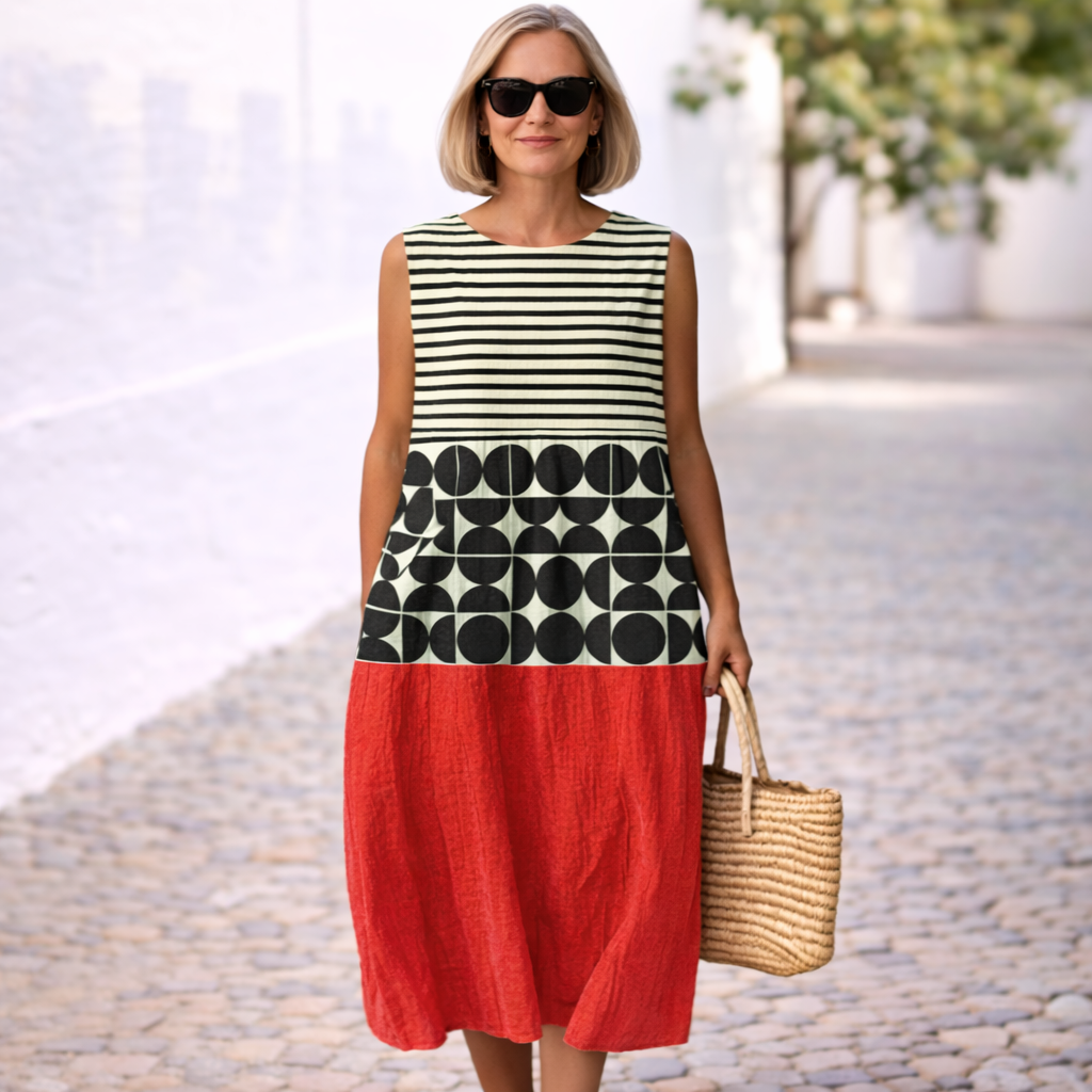 The fabric is light, supple, and drapes loosely along your body without pulling or sticking anywhere. No tight waist, no thick fabric, nothing that feels hot or stifling. Just a dress you can put on and instantly move freely in—whether you're heading out, sitting on a terrace, taking a walk, or on vacation.